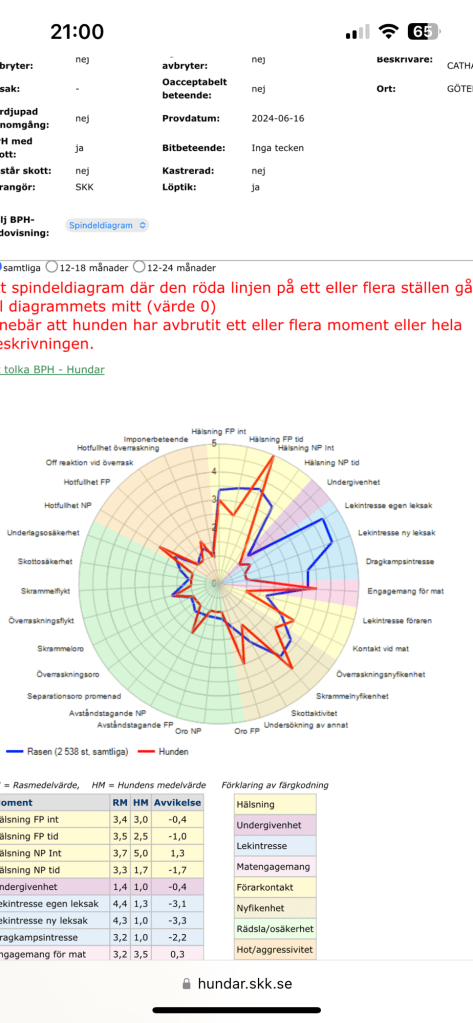 Vi var även iväg med Zelda och gjorde ett BPH med henne och hon fick mer än väl godkänt och gjorde ett riktigt snyggt prov och var nog allt precis som vi tänkte i hur hon är som individ och jag tycker nog diagrammet visar henne rättvist. Jag bifogar hennes diagram här som man gärna får läsa av eller gå in på avelsdata och kolla och läsa bedömingen där och lite förklaring 😃.