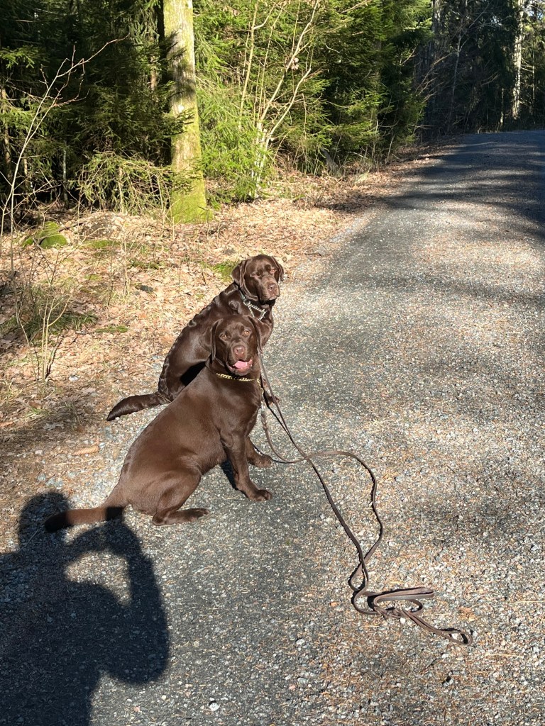 Mia fick också träna och damma av kostymen lite, Mia är suuuuuper rolig att träna med när ”påknappen” är PÅ! Vi har inte tränat så intensivt på nästan 1 år så nu ska vi träna hela våren och sommaren innan nästa snö kommer 🤪😉 så vi kan befästa en hel del plus att kanske få ett mål i att en dag kunna starta henne eller båda på startklass…. Hade ju varit så fräckt 😍 men nu ska vi inte börja galoppera innan vi kan gå och med lite fokus så kommer vi snart kunna galoppera så läxan med de båda är fotgående utan att dammsuga omgivningen 😅 och göra enkla hämtningar på dummies 😍. Vilken härlig vår och sommar vi kommer få 🙏🏻