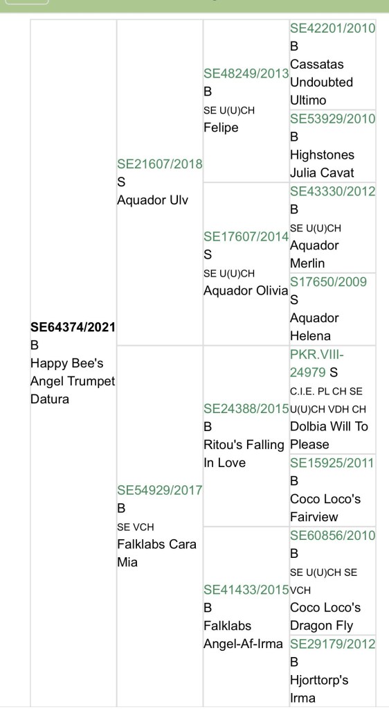 Vid ögonlysningen som gjordes så såg veterinären att Zelda har ”Katarakt Främre Y söm” på ena ögat men detta var mycket lindrig/lite och det andra ögat är helt UA. Detta har ingen som helst påverkan på Zelda och Zelda kan användas i aveln. Och med denna diagnos och med veterinärens råd och godkännande så låter vi Zelda användas i aveln men vill vara fortsatt noggranna att använda en hane som är fri.