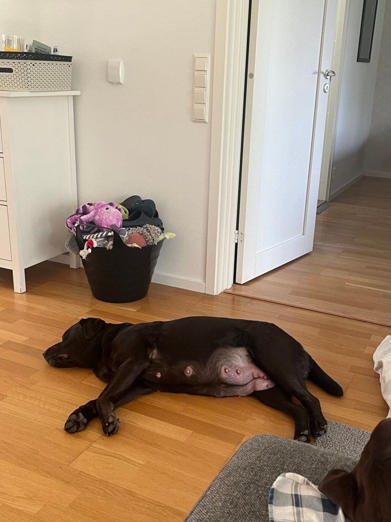 Zelda är idag på dygn 55 och i sån fin form och kondition 🫶🏻, hon följer glatt med på promenaderna och däri mellan ligger hon på jäsning och bakar de små 💕 men hon visar att hon är trygg här och det är så skönt att hon är lika självklar hos oss som hos min syster. För oss är det otroligt viktigt att djuren är trygga och då Zelda ska vara här i några månader så har det varit viktigt för oss sedan valp att hon är trygg hos oss och det är hon verkligen, även om jag tror att hon saknar sin älskade familj och jag vet att de saknar henne ❤️
